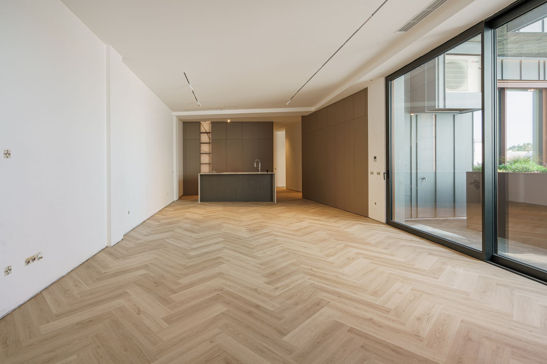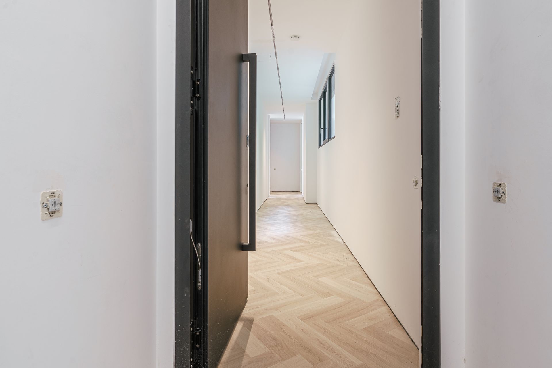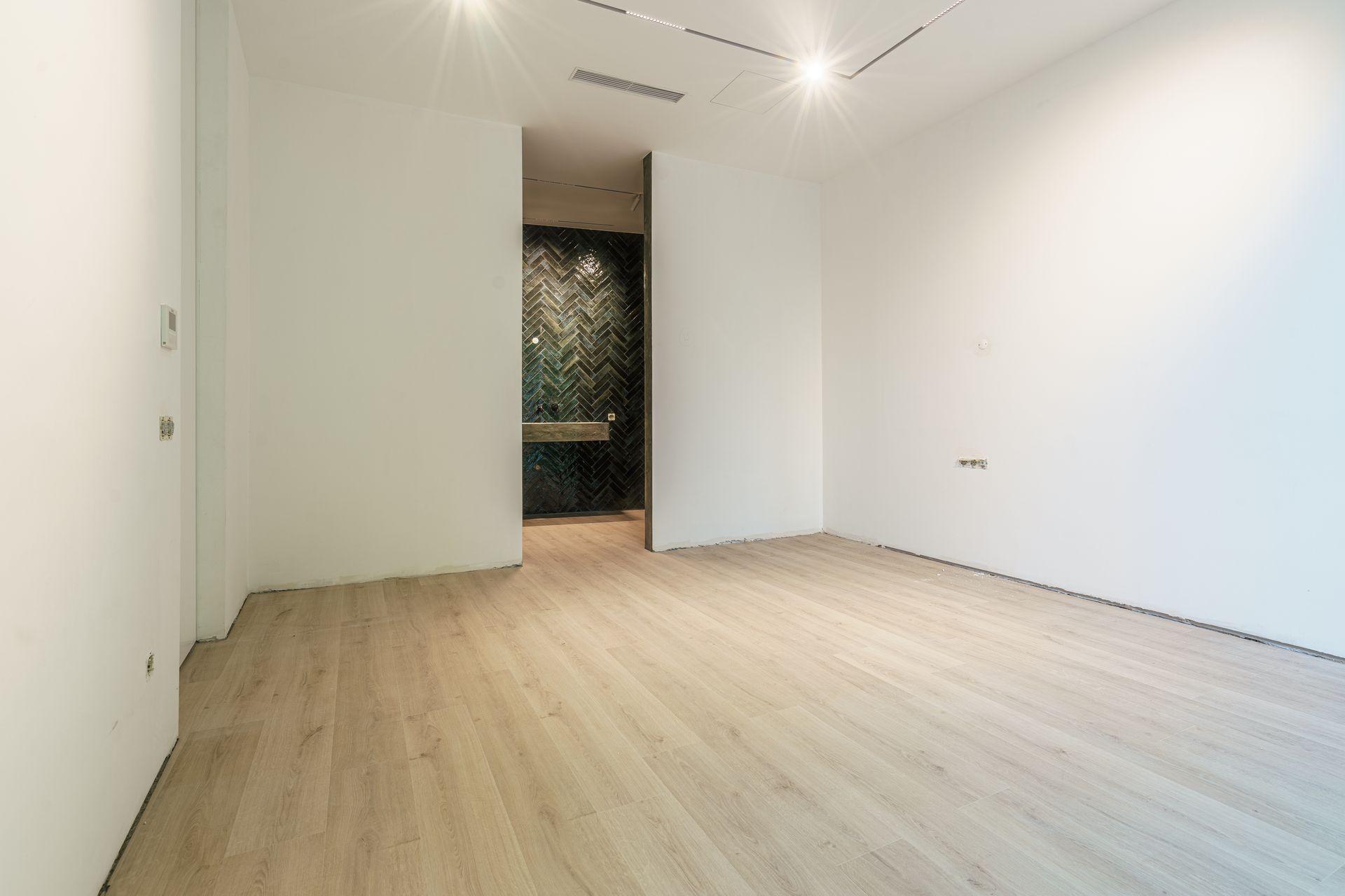 - Portas interiores embutidas e até ao teto, conferindo um visual contínuo e elegante entre as divisões.