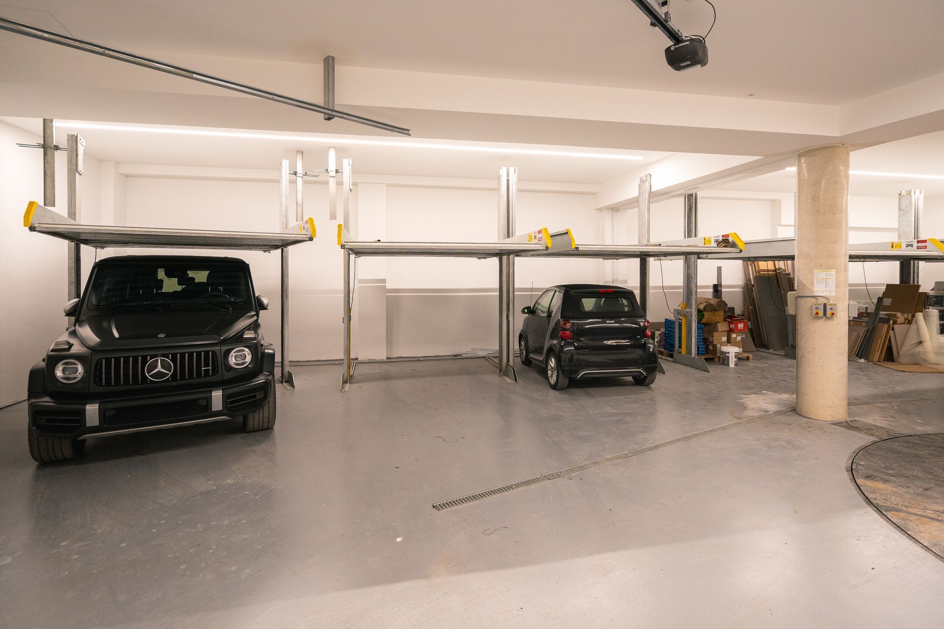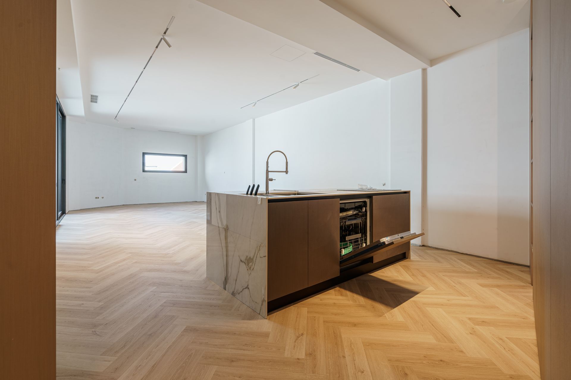 - Cozinha contemporânea e elegante, com um conceito invulgar e altamente funcional: todos os eletrodomésticos estão embutidos num armário com portas retráteis (sistema "pocket doors"), que se recolhem para o interior, criando uma linha visual limpa e minimalista quando fechadas.