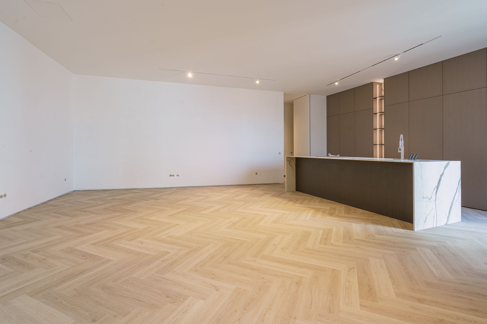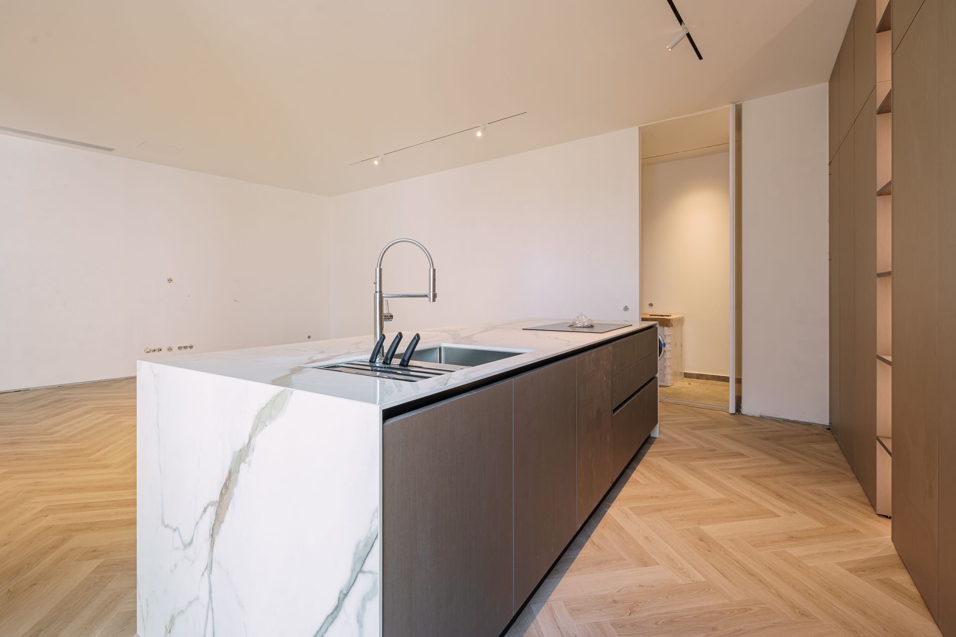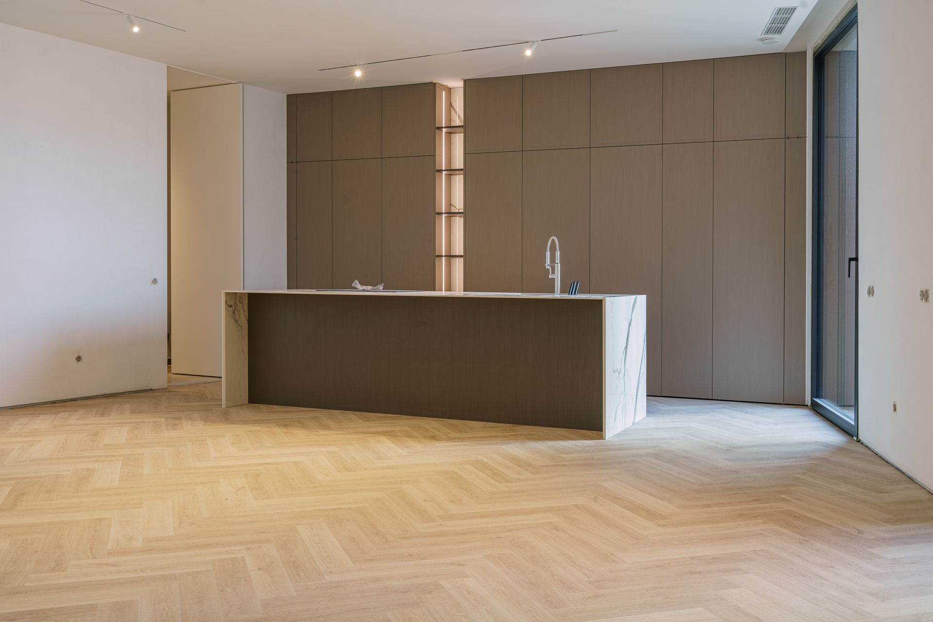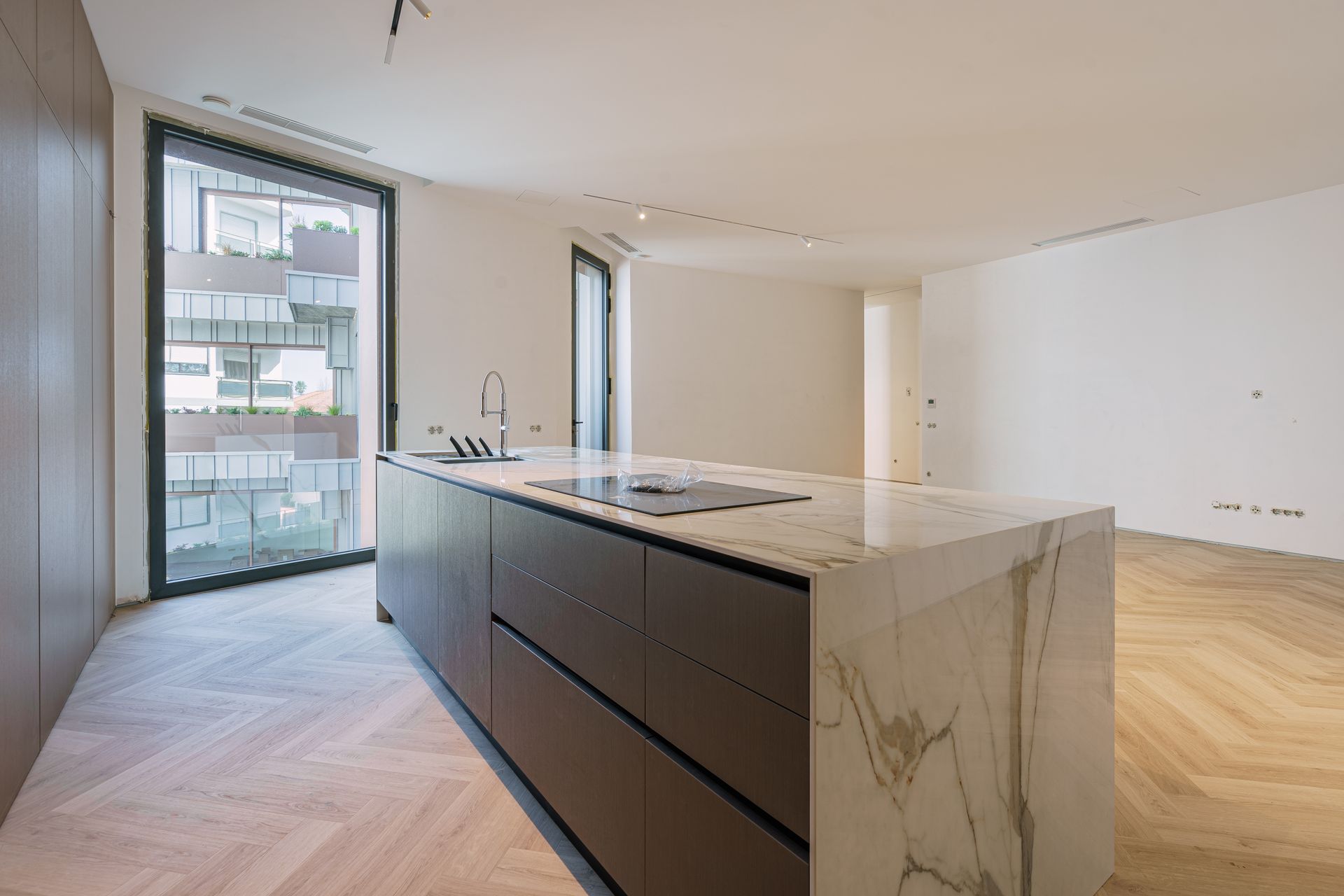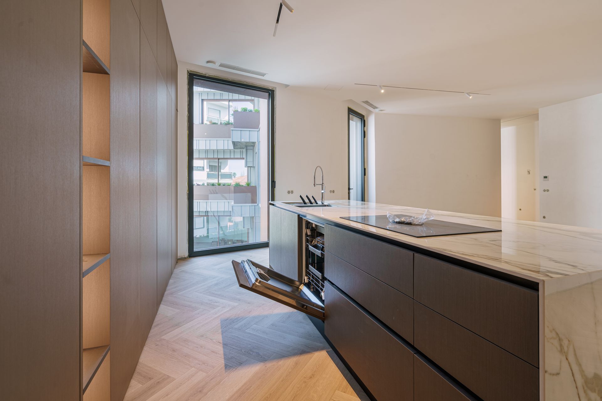 - Cozinha inovadora e elegante, equipada com todos os eletrodomésticos embutidos num armário de portas retráteis (“pocket doors”), permitindo ocultar todos os equipamentos de forma discreta e criar um ambiente limpo e minimalista.