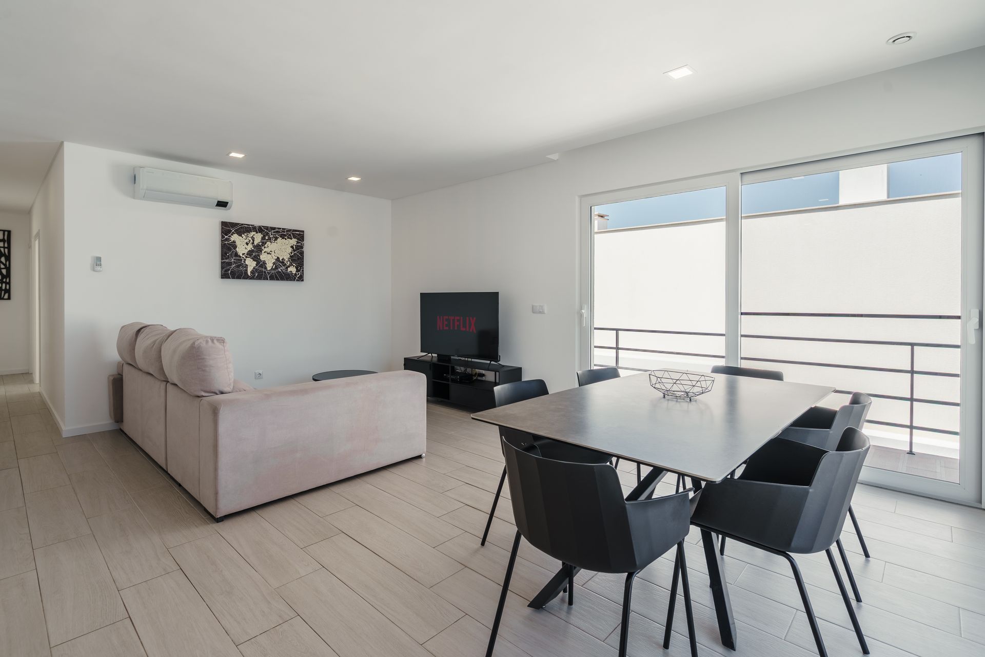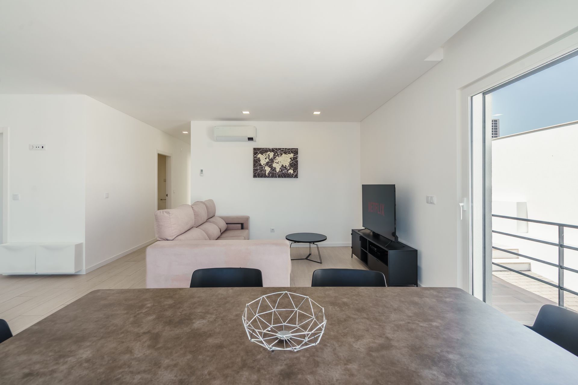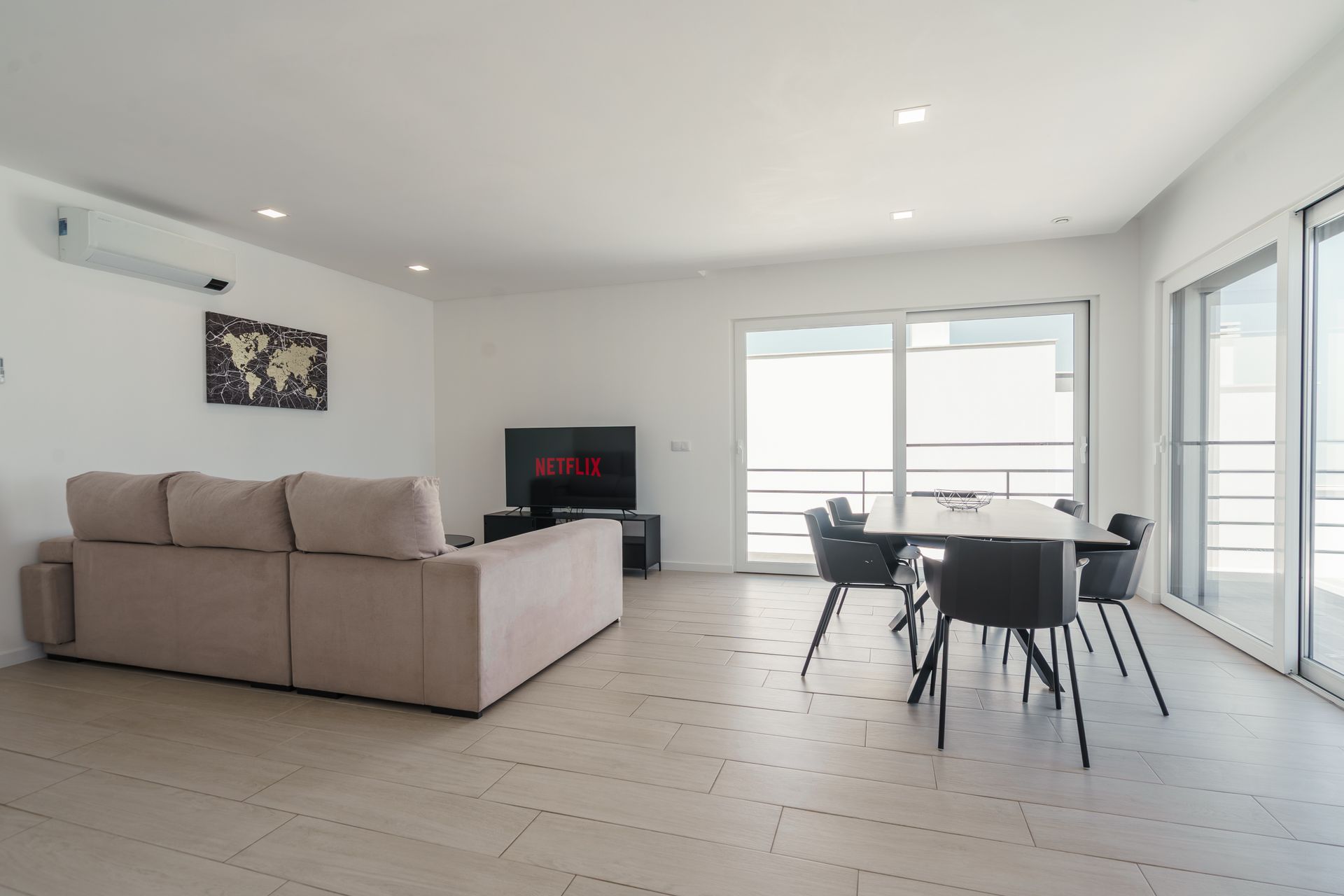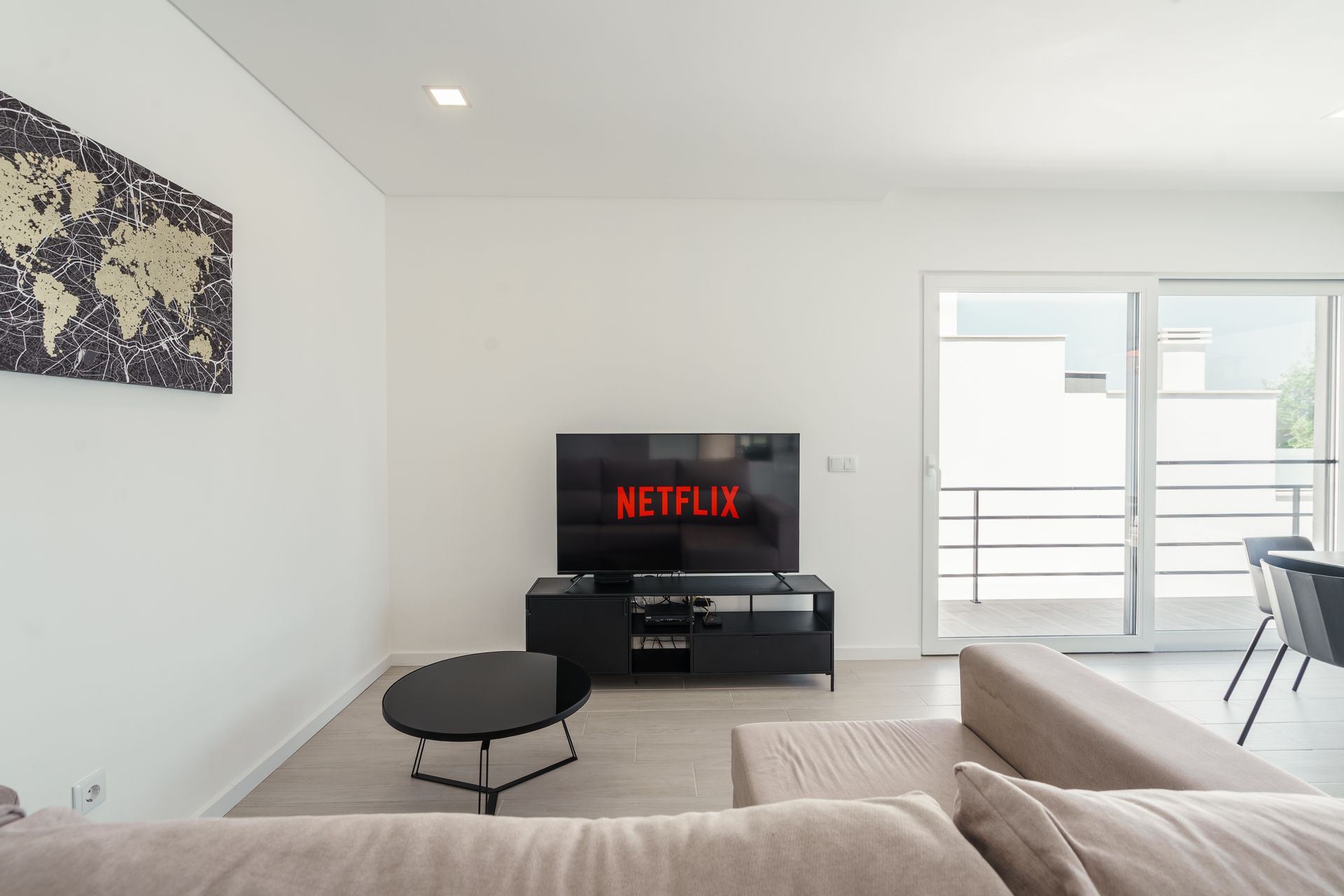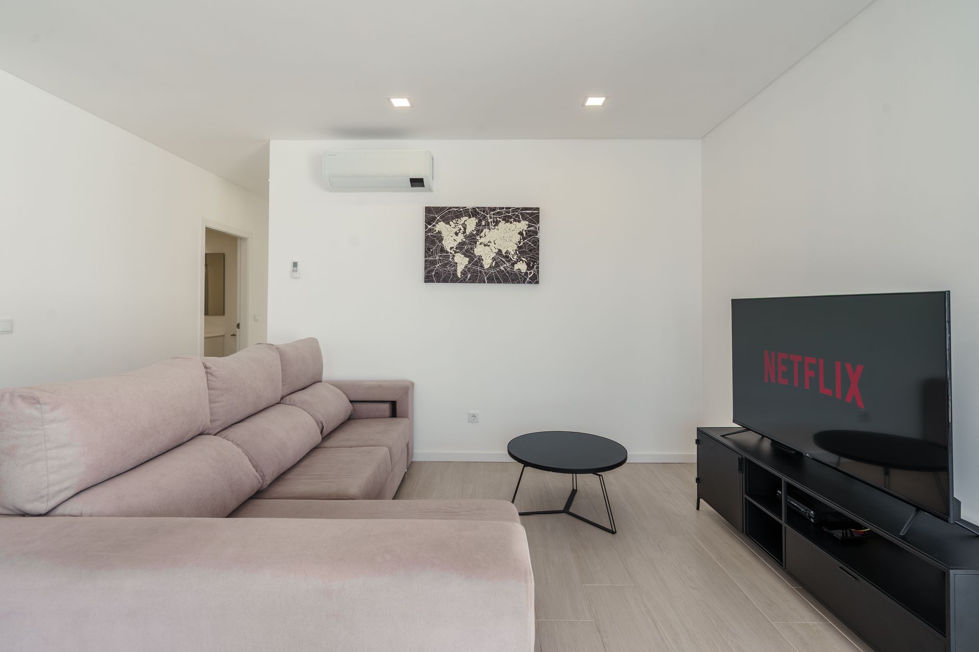 Sala de estar open-space equipada com Wi-Fi e TV com canais nacionais e internacionais, Netflix e Disney+;