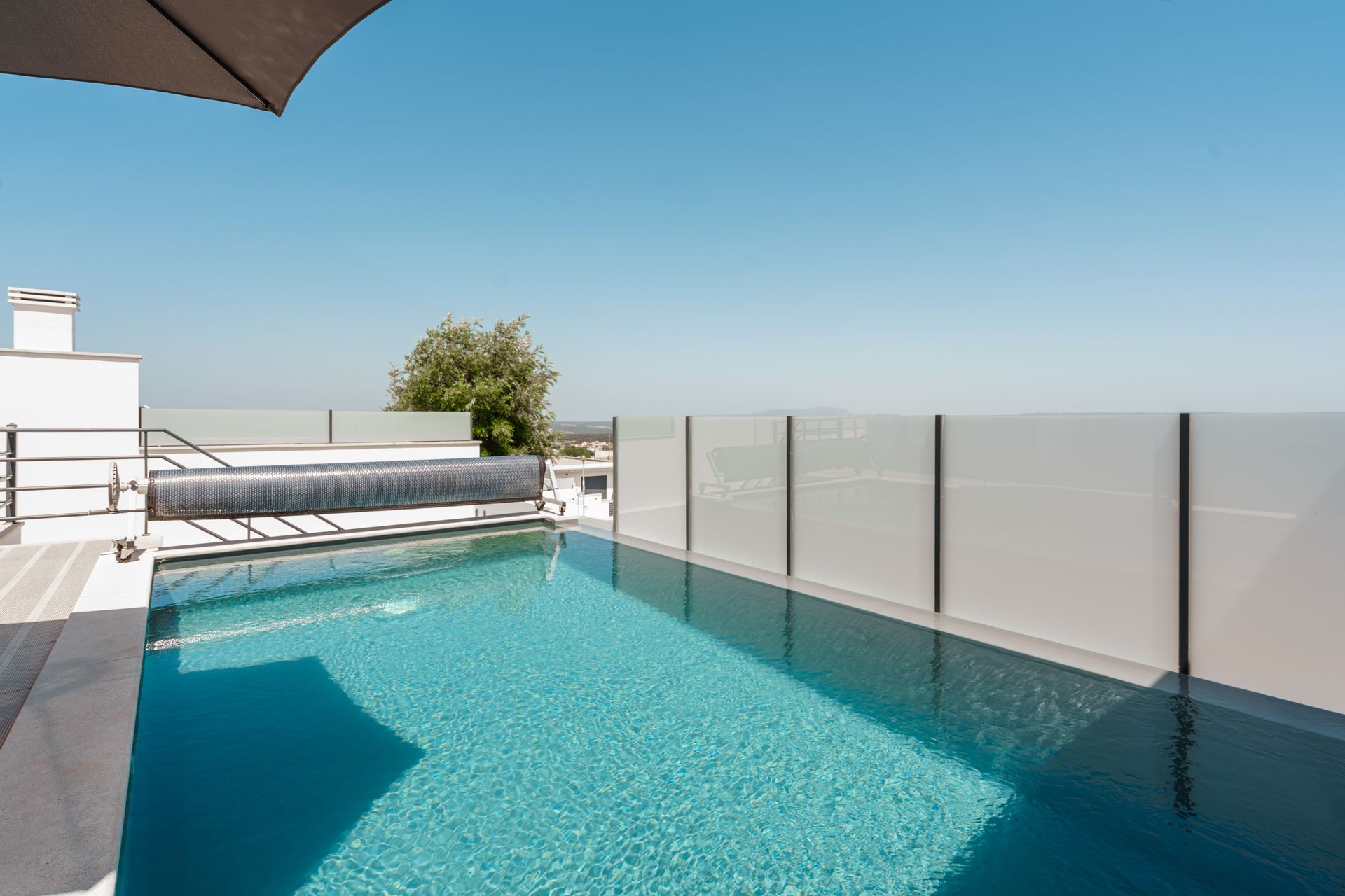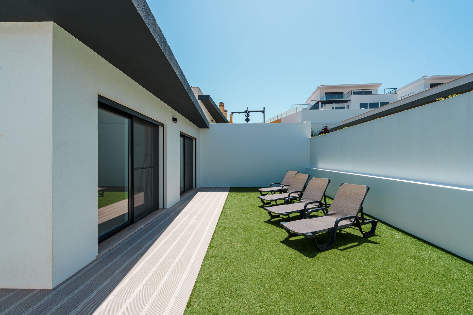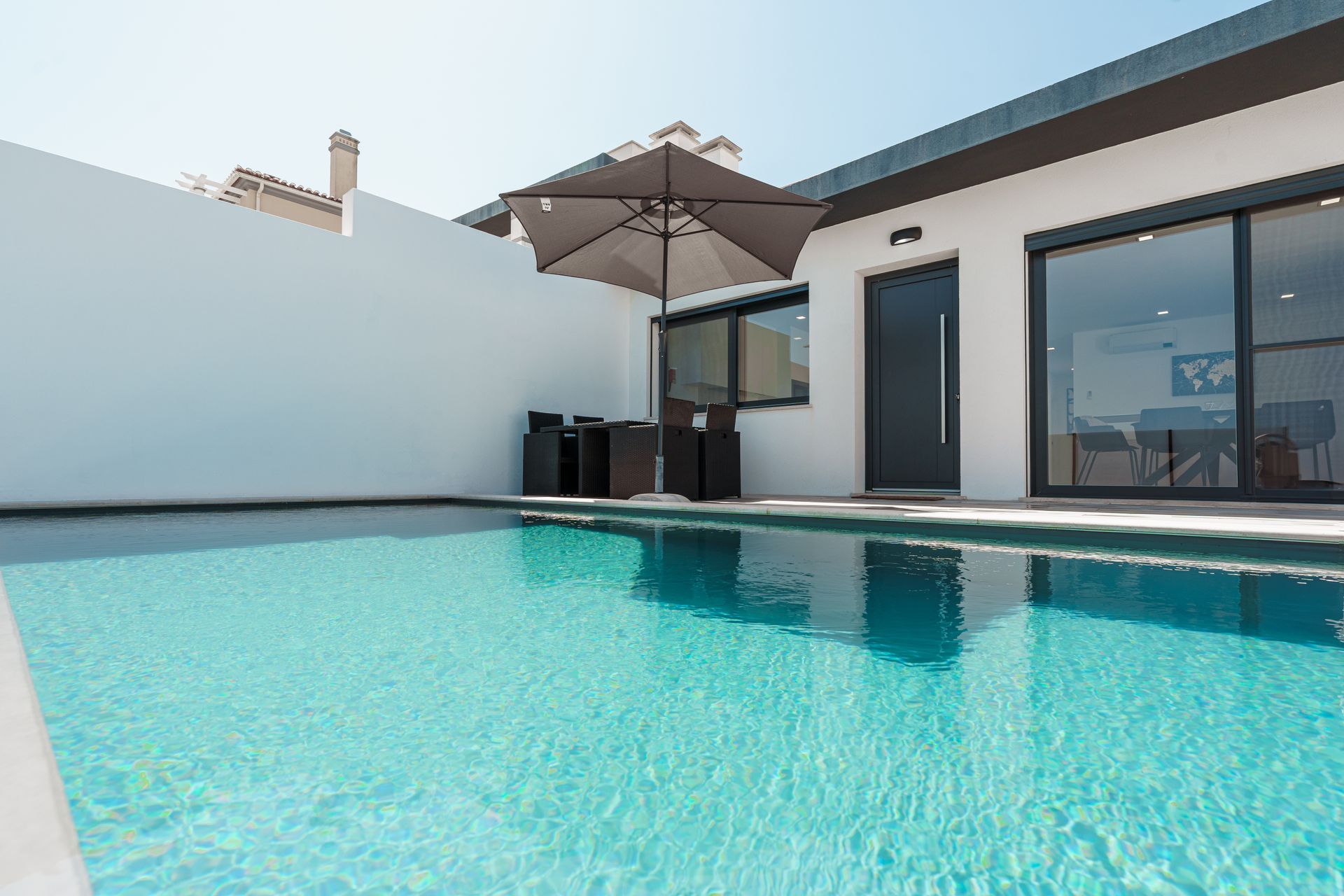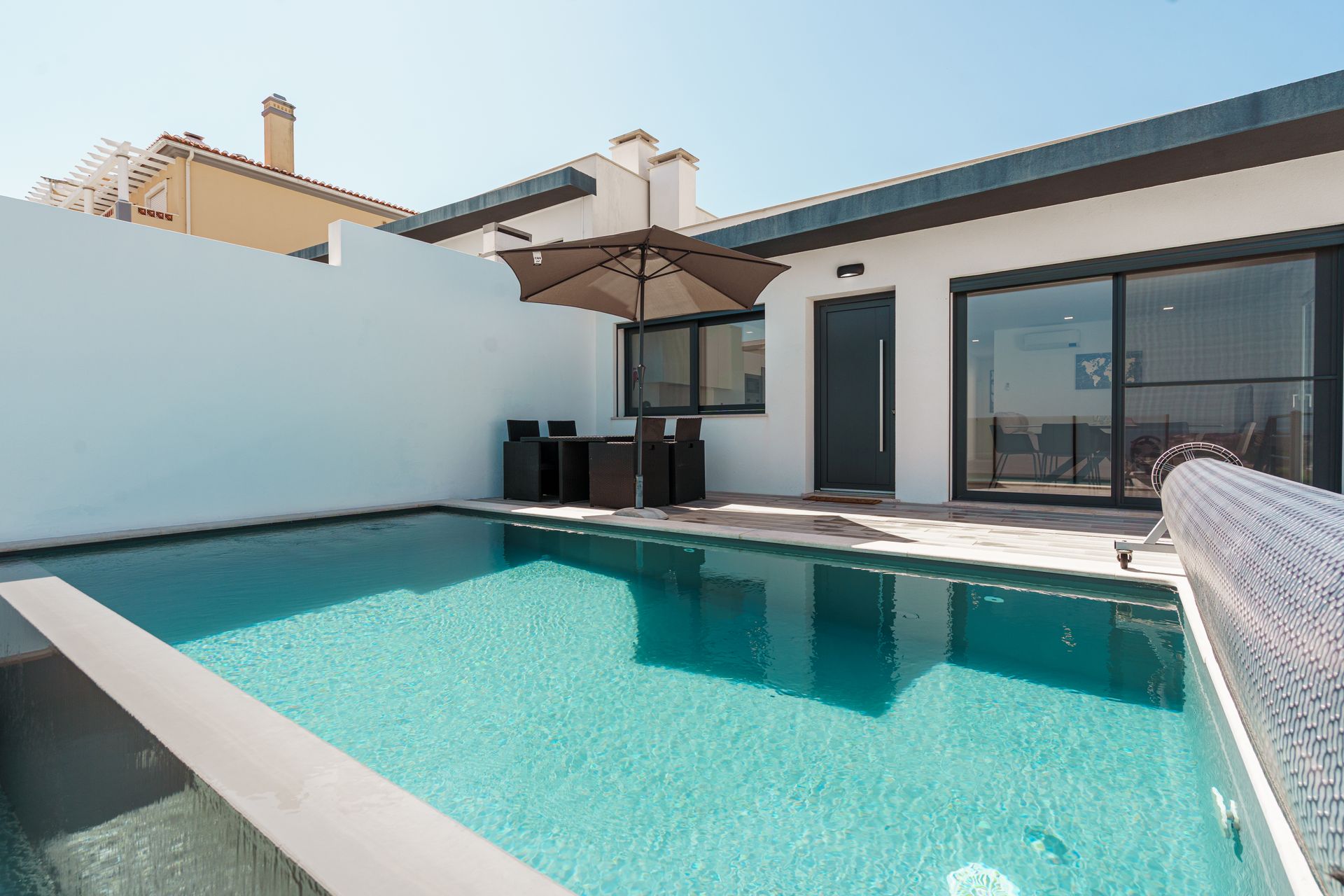 Jardim com piscina infinita privada, perfeita para relaxar e desfrutar do sol português.